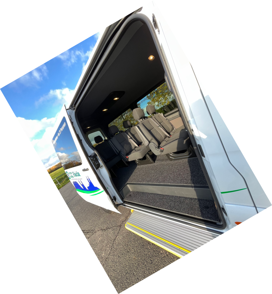 Er bietet 8 Fahrgästen genügend Platz und nimmt auch noch ihr Gepäck auf. Im Fond können es sich 6 Personen auf Einzelsitzen mit verstellbaren Rückenlehnen und Armlehnen bequem machen. Zwei weitere Fahrgäste sitzen auf einer Sitzbank in der 1. Reihe. Im Sommer sorgt die Klimaanlage hinten wie vorne für einen kühlen Kopf, während die Zusatzheizung dafür sorgt, dass sie im Winter keine kalten Füße bekommen.